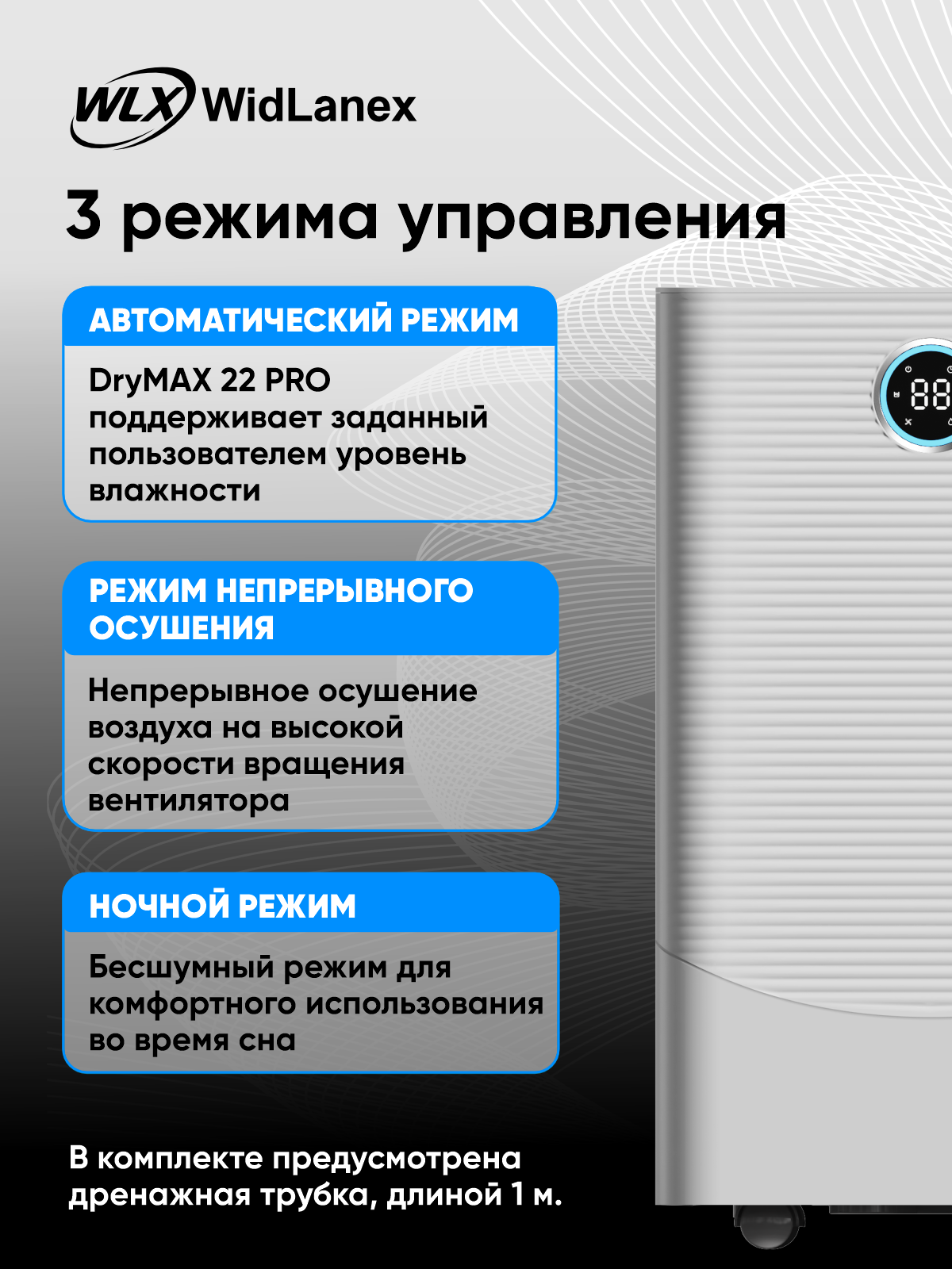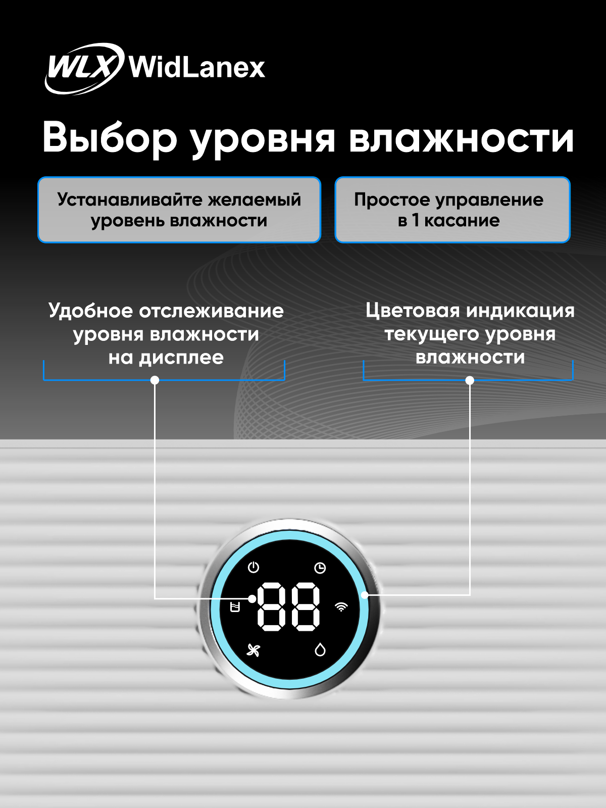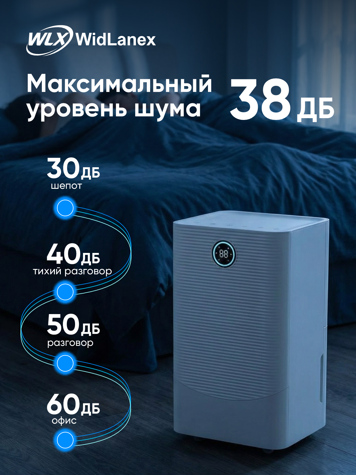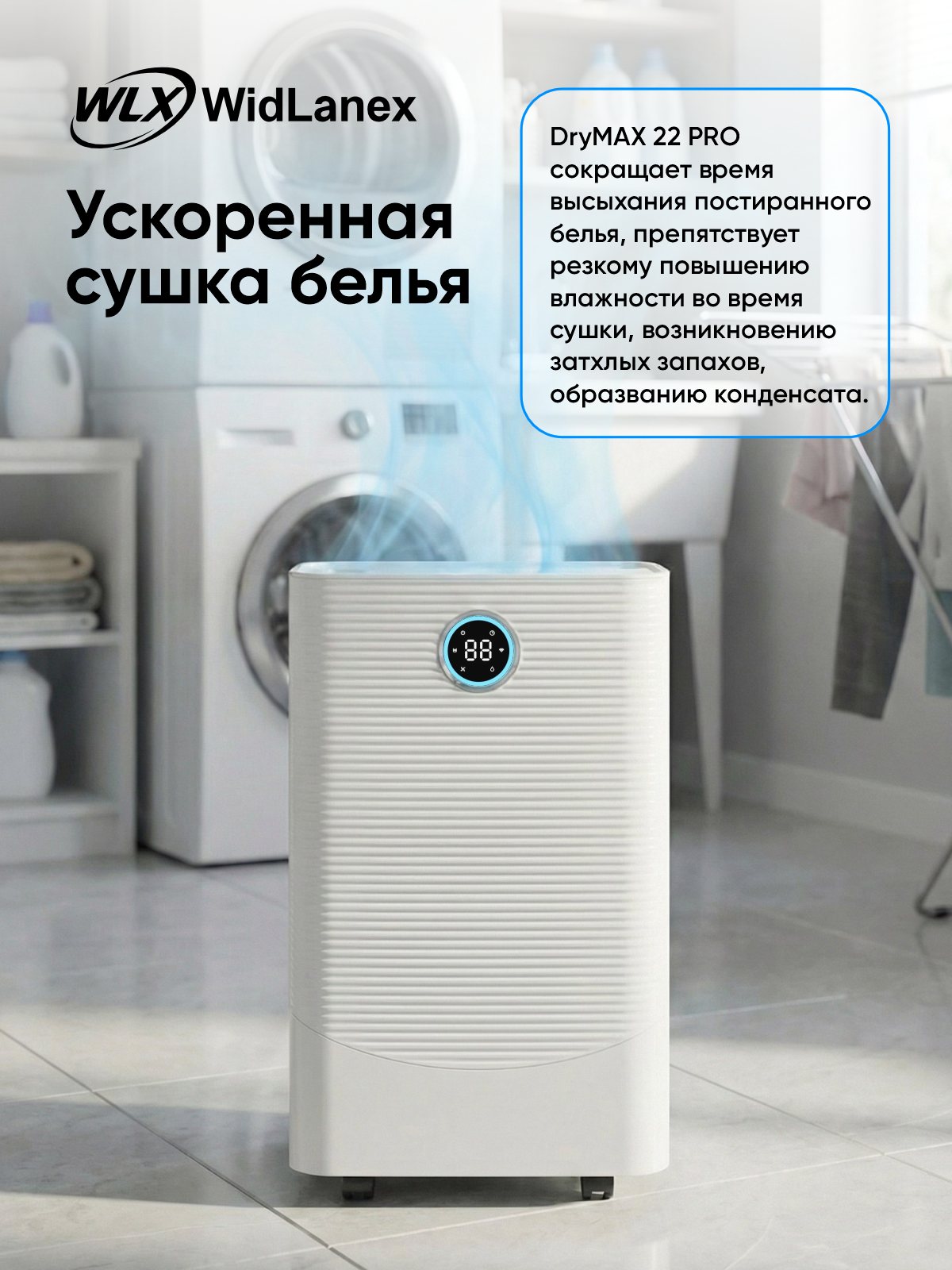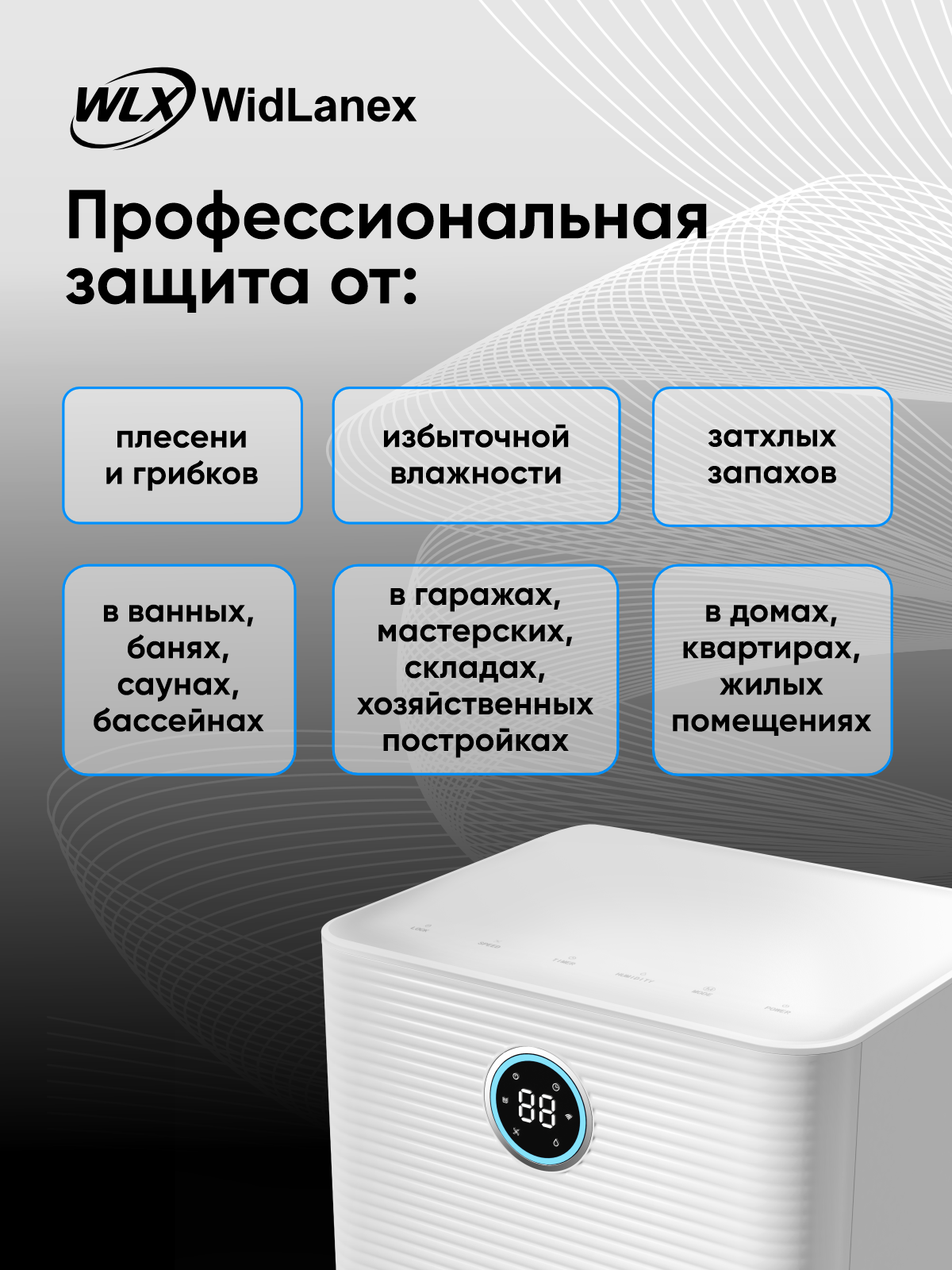 Осушитель воздуха WidLanex помогает быстро привести влажность в норму и создать комфортный микроклимат в квартире, доме или офисе. Подходит для комнат с избыточной влажностью, сыростью, запотевшими окнами, появлением плесени или неприятного запаха.